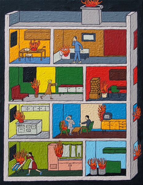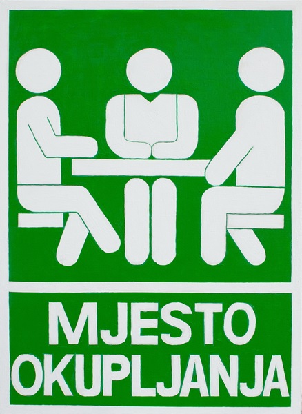 Svijetlozelena boja sugerira da je riječ o obavijesnom znaku zaštite na radu, no, naravno, takav znak zapravo ne postoji. Naime, “mjesto okupljanja” kao obavijesni znak kvadratnog je oblika i prikazuje u sredini znaka četiri osobe ili roditelje i dvoje djece skupljene u dva reda jedan do i iznad drugog. Iz uglova slika prema njima dolaze četiri strelice, a u strelicama je osoba koja trči k mjestu okupljanja (koje obično označava mjesto gdje se evakuiraju ljudi u slučaju bilo kakve ugroze). No, meni je bila nakana napraviti sliku za szid pored stola blagovaonice našeg dnevnog boravka, gdje najčešće sjedimo kad jedemo i pijemo i družimo se s prijateljima. Stoga je na mojoj slici znak mjesta okupljanja u potpunosti preinačen i prikazuje tri osobe kako sjede za stolom i druže se. Na kraju je ispalo da slika nije našla mjesto u blagavaonici, već u vjetrobranu, neposredno iza ulaznih vrata, pa time ohrabruje goste u dobrodošlici i označava našu kuću kao mjesto okupljanja dragih ljudi. Kroz apersonalno hladni apstraktni stil znakova sigurnosti i zaštite na radu slikom “Mjesto okupljanja” uspio sam iskomunicirati toplu emociju potrebe ljudi za ljudima.