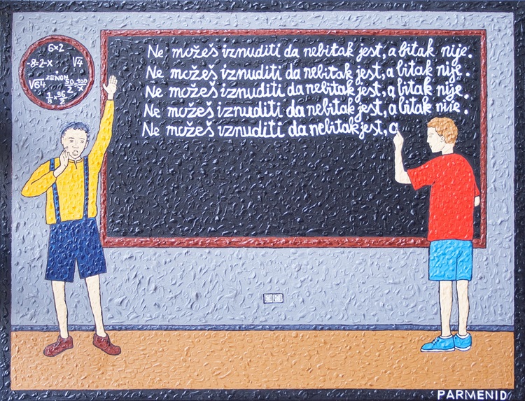 Filozofske slika, posveta predsokratovcu Parmenidu, koji je prvi izrijekom ustoličio bit(ak), za kojim otad, pod različitim imenima, počinje višestoljetna potraga. Sadržaj slike: Učenik od na slici neprisutnog učitelja, za kaznu i da više nikad ne zaboravi, dobiva nalog da cijelom duljinom školske ploče ispisuje temeljni Parmenidov uvid da bitak jest a nebitak nije. Uz lijevi rub slike njegov razredni prijatelj izvikuje i poziva sve druge učenike da svjedoče radosnu vijest o bitku koji jest. U lijevom gornjem uglu slike je matematički sat, u kojem brojevi u satu nisu izraženi izravno, već kroz formule, razlomke i jednadžbe. Sat je posveta i zove se po Parmenidovom učeniku Zenonu iz Elejske škole, koji se podosta bavio matematikom. Sat hotimice nema kazaljke, budući je Zenon pokazivao i dokazivao da kretanja, pa istime i vremena, osim kao privida, nema – odnosno da Ahilej nikada neće prestići kornjaču.