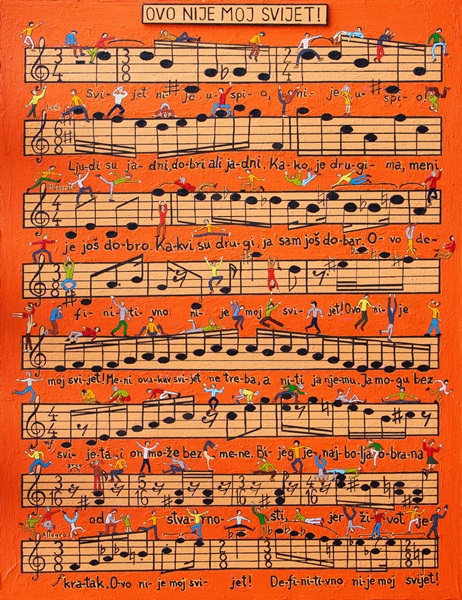 Redovi taktova notnog zapisa preuzeti su iz desne, melodijske ruke klavirskih stvari meni omiljenih skladatelja (Bartok, Prokofjev, Šostakovič, Respighi, Schoenberg, Penderecki, Stravinski i Debussy). Sam tekst pjesmice – koja se, dakako, može i pjevati – tvore rečenice koje iskazuju moj temeljni doživljaj svijeta i zbrajaju iskustvo moga života. Čovječuljci koji nehajno skaču po notama ovdje su da likovno dinamiziraju i parodiraju značenjski sloj pjesmice.