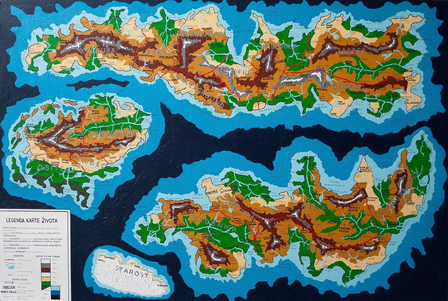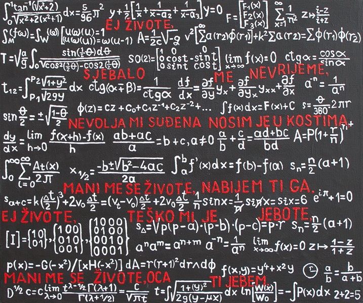 Letrizam i značenjski nepronična ljepota unizanih matematičkih formula ispisanih bijelim na crnilu platna kao školske ploče, dopušta u razmacima redova ispisivanje crvenim novog značenjskog plana, životnim dertom nabijenih stihova Branimira Štulića.