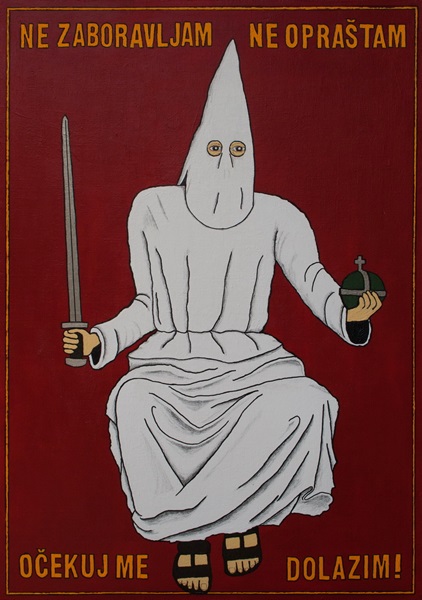 Bez obzira na to što više nalikuje pripadniku Ku Klux Klana, ovo je monumentalni Krist osvete, došao da kazni sve drkoše i jebivjetre koji su izdali poslanje svoje ljudskosti. Poruka je parafraza slogana Piratske stranke.