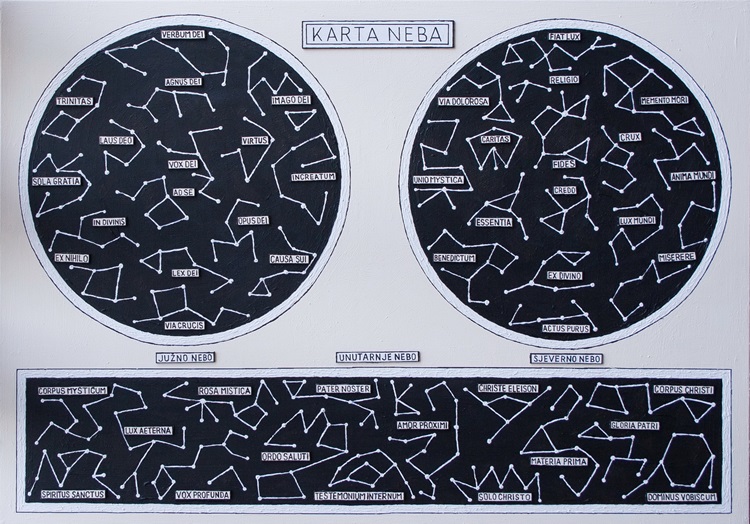 Karta se dijeli na tri dijela: Južno, Sjeverno i Unutarnje nebo, sa sazviježđima imenovanim pojmovima srednjevjekovne teologije.