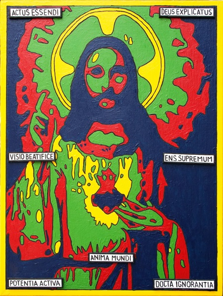Isus izrađen kao Che, grubo pojednostavljen i u crtežu i u obojenju, to jest saglediv tek u gledanju iz daljine. Ispisani pojmovi dio su latinskog teološkog pojmovlja sv. Tome Akvinskog.