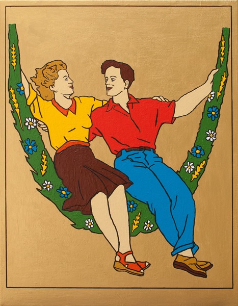 Parodija idolatrije bračne ljubavi na zlatnoj kič pozadini.