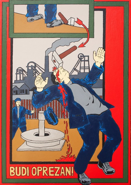 Kopija ruskog socijalističkog plakata iz staljinističke ere s tematikom zaštite na radu. Slika poručuje da ljudi imaju biti oprezni i paziti na svoje nutarnje biće.