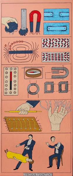 Od magnetne rudače u prirodi, magnetne potkove, fenomena magnetske indukcije, preko fenomena elektromagnetske indukcije, sve do mesmerizma i spiritualnog magnetizma gdje u posljednjoj ilustraciji veliki ludi mag sam sebi odvajaja glavu od tijela.