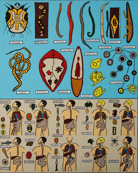 Zdravstveno edukativni mikrobiološki poster koji u gornjoj polovici prikazuje uvećane parazite i nametnike duše suvremenog čovjeka. U donjoj polovici prikazuje njihove životne cikluse, to jest načine na koji nametnici putem prijenosnih domaćina ulaze, šire se, razmnažaju i napokon razaraju ljudski organizam.