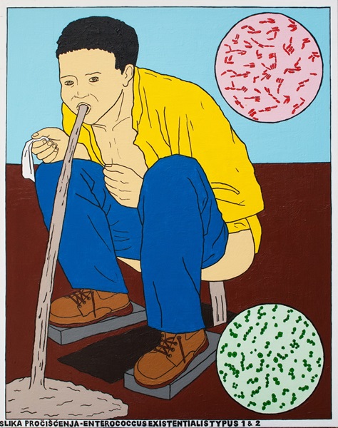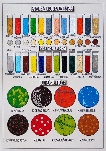 Još jedna iz serije pseudoznanstvenih slika, gdje se alkemičarski na obojenjima i sedimentima urina i urinokulturama, mogu dokazati ine životne pozicije i stanja čovjeka kao davatelja uzoraka.