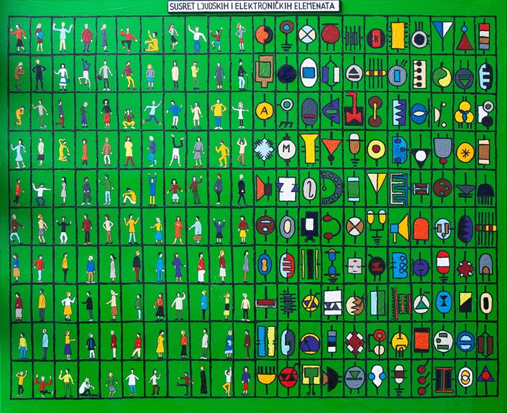 U 10 redova i 11 kolona poredani su jedan do drugoga dva sustava: onaj ljudskih i onaj elektroničkih elemenata, kako bi se međusobno ogledali u dimenziji svoje likovne privlačnosti. Da bi susret međusobno različitih sustava bio što ujednačeniji i pregledniji za usporedbu, ne samo da je jednak broj elemenata oba sustava u kolonama i redova, nego i svaki element svakog sustava ima svog parnjaka na identičnom mjestu drugog sustava koji je koloristički rješen istim obojenjem.