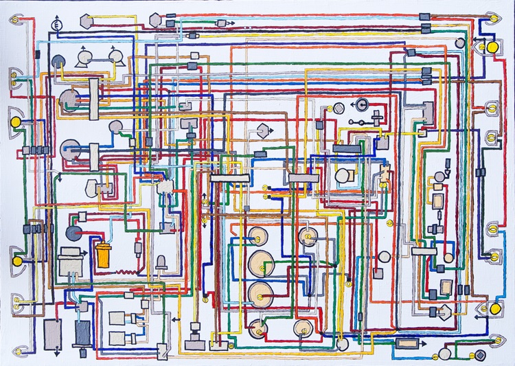 Kao dio tehničkih upustva uz starije radio prijemnike nerijetko su bili priloženi i shematski nacrti spajanja njihovih elektroničkih elemenata. Ako se oni ovako rekontekstualiziranjem izbace na ravan likovnog objekta pokazuju nesumnjivu ljepotu geometrijske apstrakcije i to posebno kada se oboje.