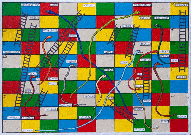 (Igra za dvoje ili više igrača) Drevna indijska igra za djecu i odrasle s moralnom poučnošću, to jest s poljima vezanim uz moralno uzdizanje (vrlinama označenim ljestvama, kojima se uspinju i preskaču polja u smjeru cilja) i moralnog propadanja (manama označenim zmijama, kojima se proklizava prema dolje i dalje od cilja). Igra se bacanjem kocke i napredovanjem zmijolikim putem od dolje prema gore, od prvog do stotog polja. Igru dinamiziraju i čine je nepredvidivom upravo preskoci ostvareni kroz zmije i ljestve, a, naravno, ovo je moralno usavršavanje i propadanje začinjeno mojim izborom tvrdih egzistencijalističko-eshatoloških pojmova i stanja.